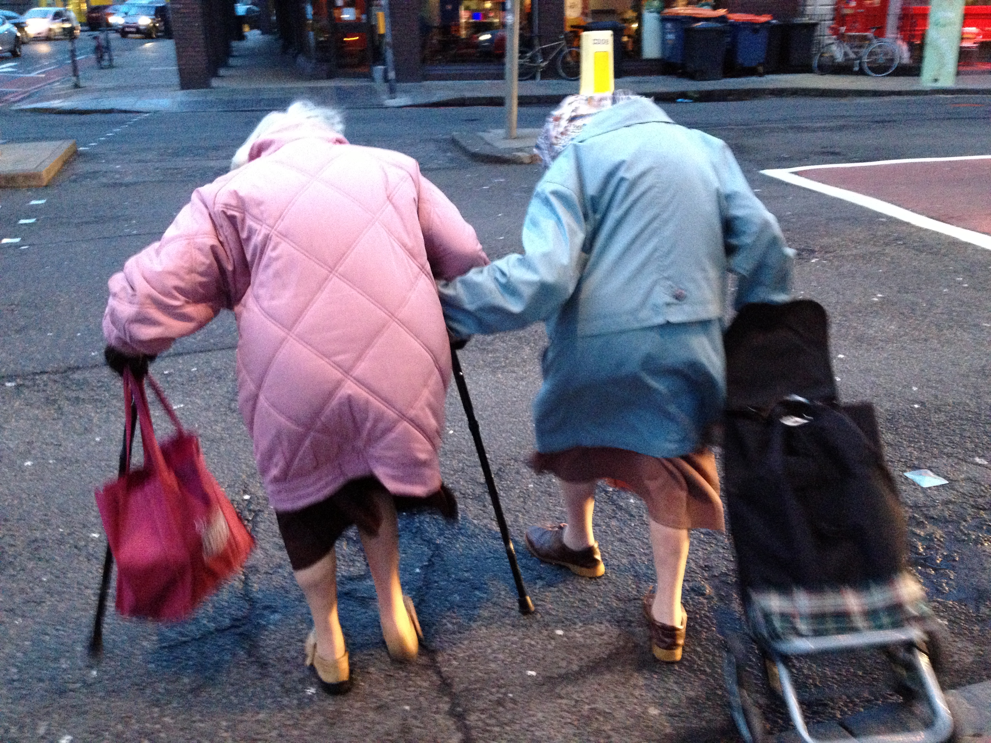 I am sitting in my car at a stop sign at a shopping center in front of Williams Sonoma, and I am observing this adorable little old gal – I’m guessing 70-ish or older. She’s dressed to the nines on this cold and windy fall day, donning a hat, gloves, her Sunday shoes, and a warm woolen coat and colorful scarf. Below her coat you can see her brightly colored dress with a yellow background and big purple flowers dotted with green foliage and blue and fuchsia smaller flowers. Her look is perfected with her 1940’s sunglasses and those thick pasty skin colored tights we remember our grandmother’s wearing – oh, and the huge handbag across her arm, I wondering if it is helping or hindering her balance. She is slowly making her way across the intersection, walking with the help of her walker. Judging from the stern look on her face, she is completely focused on the task at hand. However, I think she might be unaware that she is holding up traffic – about 5 cars deep at this point – no, no, I reconsider, I think she totally knows, she just doesn’t really care!